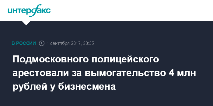 Москва. 1 сентября. INTERFAX.RU - В Московской области арестовали полицейского и двух его знакомых, которые незаконно задержали бизнесмена и потребовали у него 4 млн рублей за непривлечение к уголовной ответственности, сообщает следственное управление Следственного комитета по Московской области.