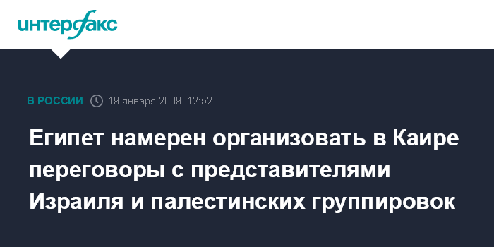 Москва. 19 января. INTERFAX.RU - Египет пригласил представителей Израиля и палестинских группировок в Каир для проведения переговоров по заключению долгосрочного перемирия в секторе Газа, сообщает израильское издание "Гаарец" со ссылкой на заявление представителя МИД Египта.