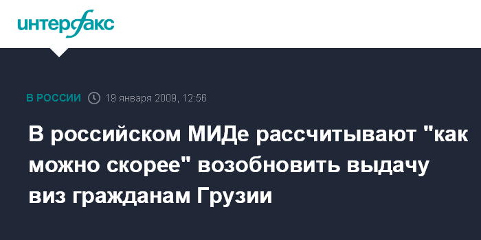 Москва. 19 января. INTERFAX.RU - Россия может в ближайшее время возобновить выдачу виз гражданам Грузии. "Как только окончательно все будет оформлено и санкционировано тремя правительствами (России, Грузии и Швейцарии) относительно работы секции российских интересов в посольстве Швейцарии в Грузии, визовые и консульские отношения будут возобновлены. Рассчитываем, что это произойдет как можно скорее", - сказал "Интерфаксу" источник в МИД РФ.
