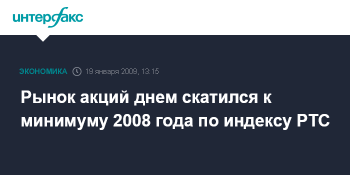 Москва. 19 января. INTERFAX.RU - Рынок акций РФ днем в понедельник скатился к минимуму 2008года по индексу РТС - в район 550 пунктов - на фоне упавшей нефти, рублевые цены бумаг на ФБ ММВБ после локального роста из-за очередного ослабления рубля Банком России также просели.
