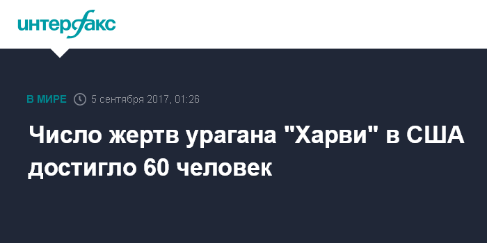Москва. 5 сентября. INTERFAX.RU - Не менее 60 человек стали жертвами урагана "Харви" в США, сообщает в понедельник агентство Asssociated Press со ссылкой на власти Техаса.