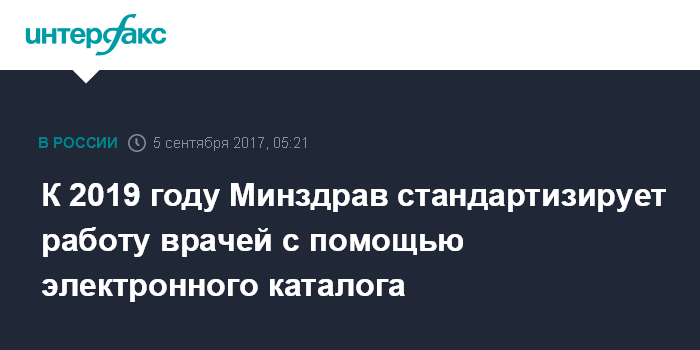 Москва. 5 сентября. INTERFAX.RU - Министерство здравоохранения (Минздрав) РФ намерено к 2019 году стандартизировать работу врачей благодаря впервые разработанной и внедряемой в России национальной системе клинических рекомендаций при основных заболеваниях, сообщает во вторник газета "Известия" со ссылкой на профильное ведомство.