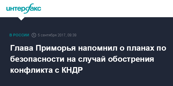 Москва. 5 сентября. INTERFAX.RU - Губернатор Приморья Владимир Миклушевский призвал не сеять панику в регионе, говоря о возможном обострении конфликтной ситуации на Корейской полуострове.