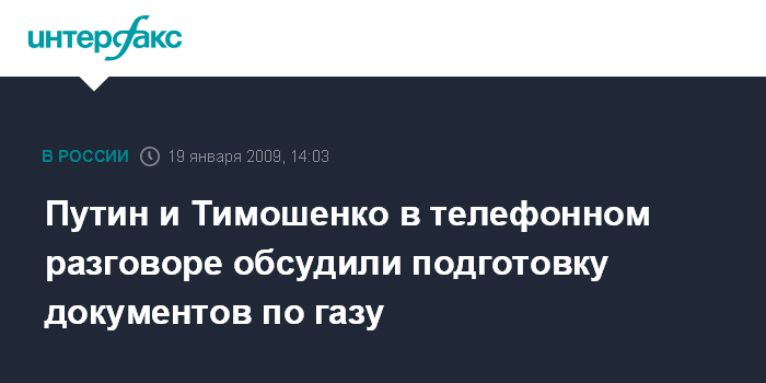 Москва. 19 января. INTERFAX.RU – Премьеры России и Украины Владимир Путин и Юлия Тимошенко обсудили по телефону подготовку к подписанию документов по газовой тематике.