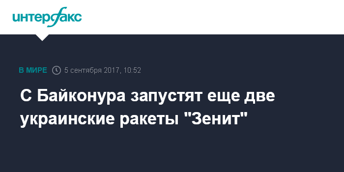 Москва. 5 сентября. INTERFAX.RU - Запуск украинской ракеты "Зенит" в декабре с Байконура не будет последним, эта ракета-носитель стартует с космодрома в Казахстане еще раз в начале 2018 года, сообщил "Интерфаксу" источник на космодроме.
