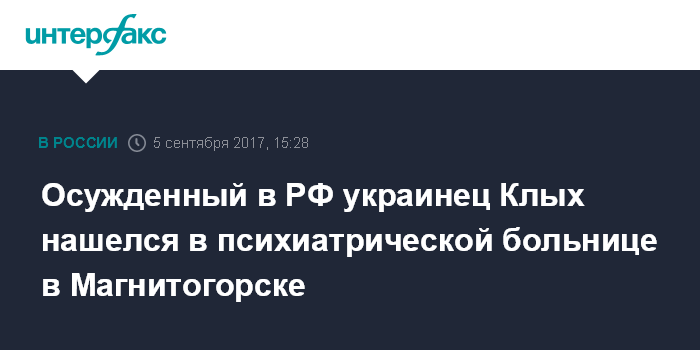 "В ответ на обращение уполномоченного Верховной Рады Украины по правам человека Валерии Лутковской уполномоченный по правам человека в РФ Татьяна Москалькова сообщила, что по состоянию на 4 сентября 2017 Станислав Клых находился на стационарном лечении в филиале психиатрической больницы Федерального казенного учреждения здравоохранения "Медико-санитарная часть №74 Федеральной службы исполнения наказаний" России в городе Магнитогорск", - сказано в сообщении уполномоченного Верховной Рады Украины по правам человека на странице в соцсети Фейсбук во вторник.