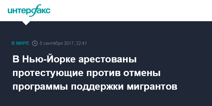 Москва. 5 сентября. INTERFAX.RU - Полиция Нью-Йорка арестовала 34 участника демонстрации против решения президента США Дональда Трампа об отмене программы DACA, защищающей молодых нелегальных иммигрантов от депортации из США, сообщил во вторник телеканал ABC News. Согласно сообщению, протестующие были арестованы напротив "Башни Трампа" - здания, принадлежащего компании американского президента.