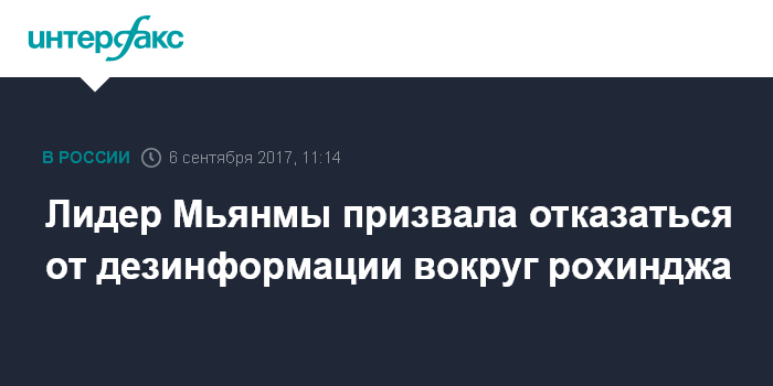 Москва. 6 сентября. INTERFAX.RU - Фактическая глава Мьянмы госсоветник Аун Сан Су Чжи назвала "нарастающим комом дезинформации" сообщения, поступающие в прессу о конфликте с мусульманами-рохинджа в этой стране.