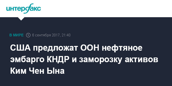 Москва. 6 сентября. INTERFAX.RU - Вашингтон предлагает заморозить активы лидера Северной Кореи Ким Чен Ына и ввести эмбарго на поставки нефти Пхеньяну