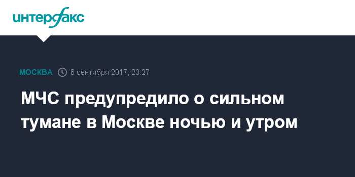 Москва. 6 сентября. INTERFAX.RU - Сильный туман ожидается в Москве ночью со среды на четверг и утром четверга, сообщили "Интерфаксу" в столичном главка МЧС.
