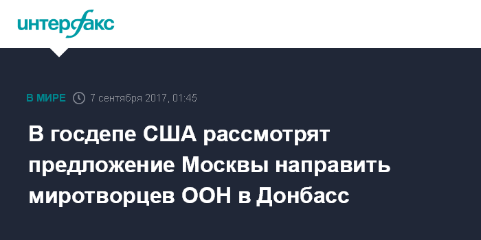 Москва. 7 сентября. INTERFAX.RU - Госдеп США полагает, что идея российского руководства разместить миротворцев ООН в Донбассе "достойна рассмотрения", сообщило агентство Associated Press.