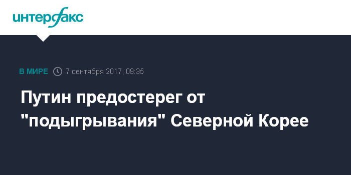 Москва. 7 сентября. INTERFAX.RU - Президент России Владимир Путин заявил, что Северная Корея провоцирует нагнетание ситуации, но ей нельзя подыгрывать, и выразил надежду, что действующая администрация США способна предпринять усилия для разрядки обстановки в регионе.
