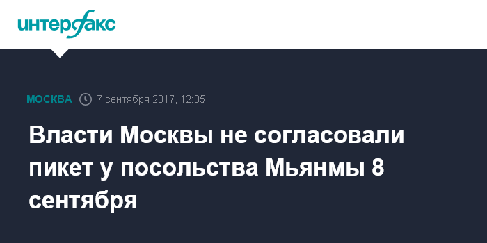 Москва. 7 сентября. INTERFAX.RU - Правительство Москвы отказалось согласовать пикет у здания посольства Мьянмы на Большой Никитской улице, сообщил "Интерфаксу" организатор мероприятия Арслан Хасавов. Мероприятие с числом участников до 200 человек планировалось провести в пятницу с 7 до 9 часов вечера.