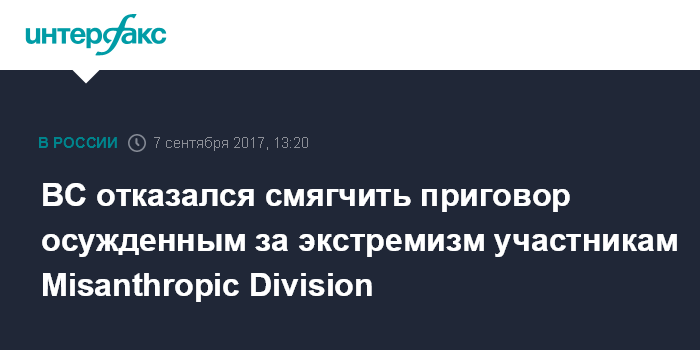 Москва. 7 сентября. INTERFAX.RU - Верховный суд России в четверг признал законным приговор троим участникам экстремистского сообщества Misanthropic Division (запрещено в РФ - ИФ), получившим от 3 до 3,5 лет колонии за экстремизм и оправдание терроризма, сообщил "Интерфаксу" адвокат Матвей Цзен.
