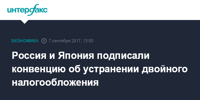 Москва. 7 сентября. INTERFAX.RU - Правительства России и Японии подписали конвенцию об устранении двойного налогообложения в отношении налогов на доходы и о предотвращении уклонения от уплаты налогов и протокол к ней. Документ был подписан по итогам переговоров президента Владимира Путина и премьер-министра Японии Синдзо Абэ, прошедших в рамках третьего Восточного экономического форума во Владивостоке.