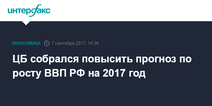 Москва. 7 сентября. INTERFAX.RU - Прогноз Банка России по росту ВВП РФ в 2017 году может быть повышен с действующего интервала 1,3-1,8%, не исключено, что в новый интервал войдут ожидания Минэкономразвития в 2-2,1%, сообщил в интервью "Интерфаксу" глава департамента денежно-кредитной политики ЦБ РФ Игорь Дмитриев.
