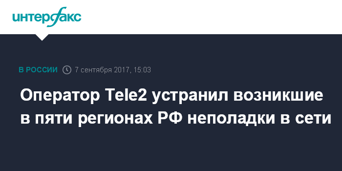 Как сообщили "Интерфаксу" в пресс-службе Tele2, в пяти регионах были зафиксированы проблемы с магистральными каналами. "Наши технические специалисты перевели абонентов на резервные каналы. В 12:45 мск сервис был восстановлен и сейчас работает в полном объеме", - сказали в пресс-службе.