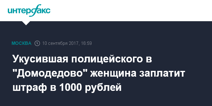 Москва. 10 сентября. INTERFAX.RU - Пассажирка рейса "Москва-Краснодар", которая покусала полицейского во время ее снятия с рейса за нарушение общественного порядка, обязана выплатить штраф в размере 1000 рублей, сообщила официальный представитель МВД России Ирина Волк.