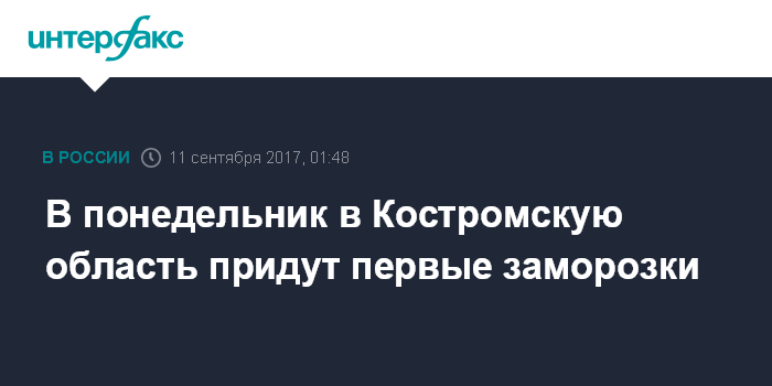 Москва. 11 сентября. INTERFAX.RU - По данным центра гидрометеорологии и мониторинга окружающей среды в Костромской области ночью и утром понедельника прогнозируются заморозки, сообщили "Интерфаксу" в главном управлении МЧС по Костромской области.