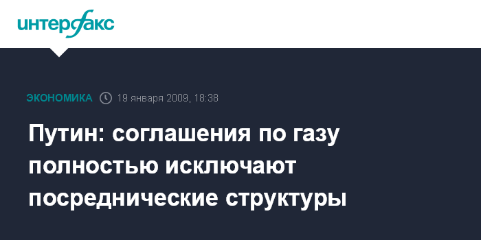 Москва. 19 января. INTERFAX.RU - Премьер-министр России Владимир Путин сообщил, что теперь посредников в торговле российским газом с Украиной не будет.