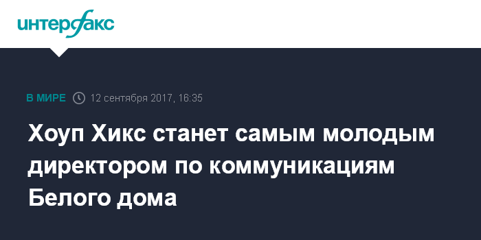 Москва. 12 сентября. INTERFAX.RU - Исполняющая обязанности директора по коммуникациям Белого дома 28-летняя Хоуп Хикс будет назначена на эту позицию на постоянной основе, сообщила во вторник телеканалу NBC News официальный представитель американской администрации Сара Сандерс.