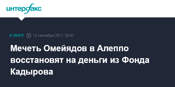 Москва. 12 сентября. INTERFAX.RU - Фонд Ахмата Кадырова перечислил $14 млн на восстановление в Сирии Мечети Омейядов - главной мечети города Алеппо, разрушенной террористами в апреле 2013 года, сообщил муфтий города Алеппо Махмуд Акем.