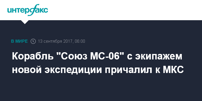Москва. 13 сентября. INTERFAX.RU - Корабль "Союз МС-06" с экипажем очередной экспедиции прибыл на Международную космическую станцию (МКС), сообщили "Интерфаксу" в Роскосмосе.