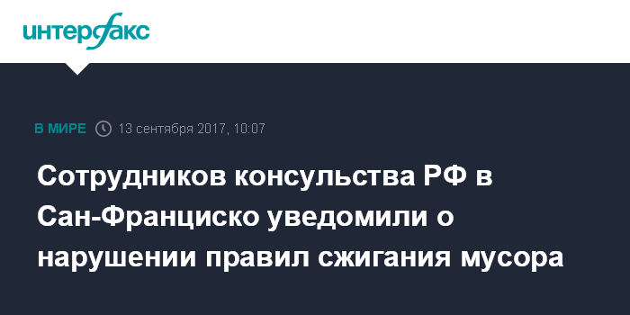 Москва. 13 сентября. INTERFAX.RU - Управление по контролю за качеством воздуха одного из районов Сан-Франциско направило сотрудникам закрытого недавно российского консульства уведомление о нарушении, связанное со "сжиганием мусора", сообщает американский телеканал CBS San Francisco.