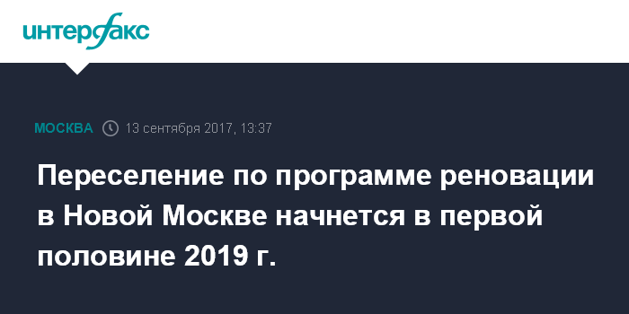 Москва. 13 сентября. INTERFAX.RU - Первые переселенцы по программе реновации в Новой Москве смогут заехать в новое жилье в первой половине 2019 года. Об этом заявил журналистам в среду на выставке ProEstate руководитель департамента развития новых территорий Москвы Владимир Жидкин.