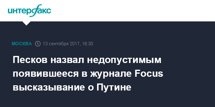 Москва. 13 сентября. INTERFAX.RU - Оскорбительные публикации в адрес президента РФ Владимира Путина недопустимы, заявил пресс-секретарь главы государства Дмитрий Песков, комментируя ситуацию с публикациями в немецком журнале Focus.