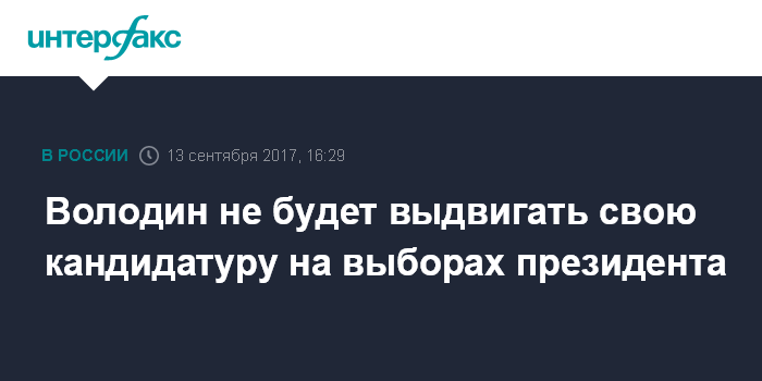 Москва. 13 сентября. INTERFAX.RU - Спикер Госдумы Вячеслав Володин заявил, что не собирается выдвигаться кандидатом на грядущих президентских выборах и ожидает, что это сделает нынешний глава государства Владимир Путин.