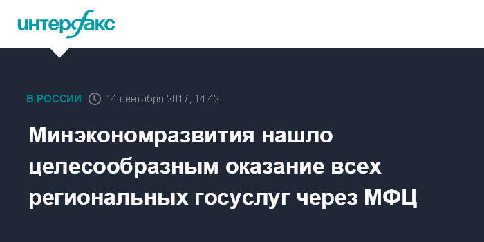 Москва. 14 сентября. INTERFAX.RU - Министерство экономического развития РФ считает целесообразным и экономически эффективным оказание всех региональных государственных услуг через МФЦ.