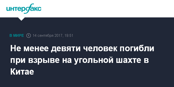 Москва. 14 сентября. INTERFAX.RU - Не менее девяти человек стали жертвами взрыва на угольной шахте на северо-востоке Китая в провинции Хэйлунцзян. Об этом сообщает агентство Associated Press.