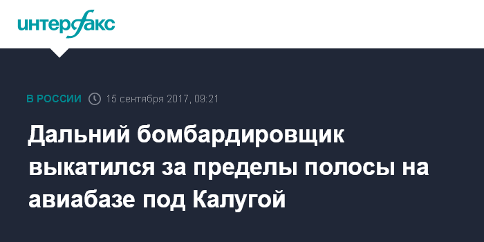 Москва. 15 сентября. INTERFAX.RU - Дальний бомбардировщик Ту-22 выкатился за пределы взлетно-посадочной полосы на авиабазе в Калужской области, но повреждений не получил, сообщил "Интерфаксу" источник в экстренных службах региона.