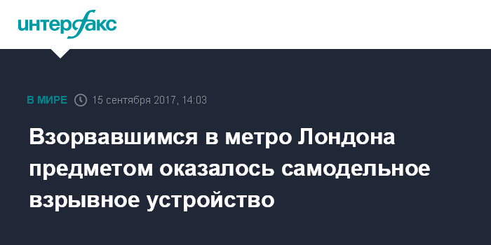 Москва. 15 сентября. INTERFAX.RU - Скотланд-Ярд подтверждает, что в вагоне лондонского метро в пятницу сработало самодельное взрывное устройство.