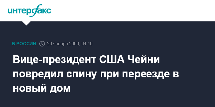 Вашингтон. 20 января. ИНТЕРФАКС - Уходящий во вторник со своего поста вице-президент Ричард Чейни повредил себе спину, когда носил коробки во время переезда в свой новый дом.