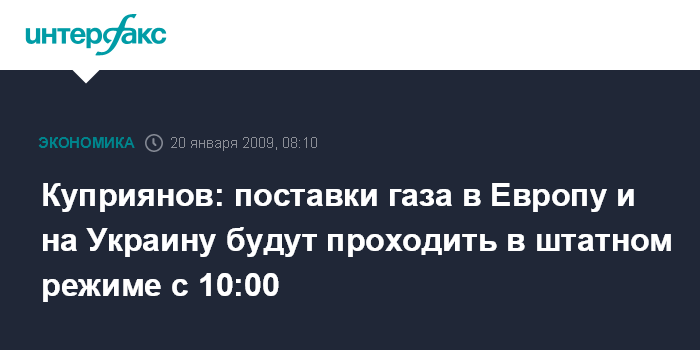 Москва. 20 января. INTERFAX.RU - Поставки газа в Европу и на Украину будут проходить в штатном режиме с 10:00 мск вторника, заявил "Интерфаксу" официальный представитель ОАО "Газпром" Сергей Куприянов