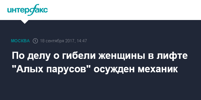 Москва. 18 сентября. INTERFAX.RU - Хорошевский суд Москвы признал виновным и приговорил к 3,5 года колонии общего режима электромеханика Андрея Белоусова по делу о гибели женщины из-за падения лифта в элитном жилом комплексе "Алые Паруса", сообщила "Интерфаксу" пресс-секретарь суда Елена Гуменная.