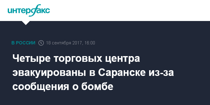 Москва. 18 сентября. INTERFAX.RU - Посетителей и персонал четырех торговых центров Саранска (Мордовия) эвакуировали в понедельник после анонимного звонка о якобы заложенных взрывных устройствах.