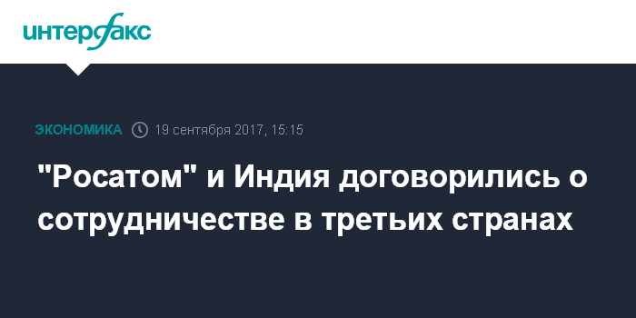 Москва. 19 сентября. INTERFAX.RU - ГК "Росатом" и Индия договорились о сотрудничестве в третьих странах, заявил журналистам глава компании Алексей Лихачев.
