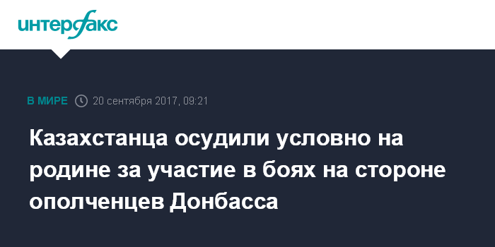 Москва. 20 сентября. INTERFAX.RU - Суд города Семея Восточно-Казахстанской области приговорил местного жителя к трем с половиной годам лишения свободы условно за участие в боевых действиях на востоке Украины, сообщили в среду "Интерфаксу" в пресс-службе суда.