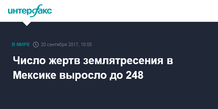 Москва. 20 сентября. INTERFAX.RU - Сильное землетрясение в Мексике, по последним данным, привело к гибели не менее 248 человек, сообщают в среду западные СМИ со ссылкой на власти страны.