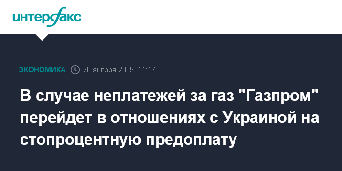 Москва. 20 января. INTERFAX.RU - В случае неплатежей за газ "Газпром" перейдет в отношениях с Украиной на стопроцентную предоплату, сообщил глава "Газпрома" Алексей Миллер на встрече с президентом РФ Дмитрием Медведевым во вторник.
