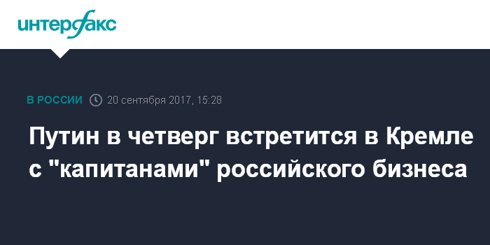 Москва. 20 сентября. INTERFAX.RU - Президент РФ Владимир Путин в четверг проведет встречу с представителями российский деловых кругов и объединений, сообщили в пресс-службе Кремля.