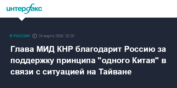 Глава МИД КНР благодарит Россию за поддержку принципа "одного Китая" в связи с ситуацией на Тайване