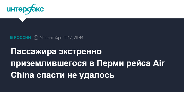 Москва. 20 сентября. INTERFAX.RU - Пассажир самолета китайской авиакомпании Air China, следовавшего рейсом Пекин-Дюссельдорф и экстренно приземлившегося в Перми, скончался. Об этом сообщил "Интерфаксу" источник в службе "скорой помощи" города.
