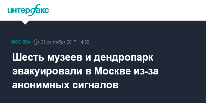 Москва. 21 сентября. INTERFAX.RU - Около 3 тысяч человек эвакуированы из шести музеев и дендропарка в Москве после анонимных сообщений о заложенных в зданиях взрывных устройствах, сообщил "Интерфаксу" в четверг информированный источник.