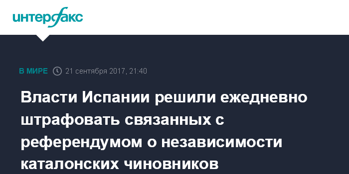 Москва. 21 сентября. INTERFAX.RU - Конституционный суд Испании принял решение о ежедневных штрафов в размере до 12 тысяч евро в отношении членов правительства Каталонии, причастных к планам проведения референдума о независимости, сообщили в четверг испанские СМИ.