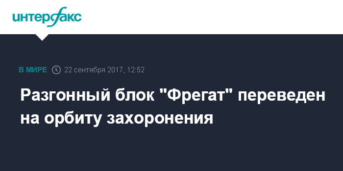 "После выведения на орбиту космического аппарата (КА) "Глонасс-М", запущенного в 03:03 по московскому времени 22 сентября с космодрома Плесецк ракетой-носителем (РН) среднего класса "Союз-2.1б", специалисты Главного испытательного космического центра имени Титова провели операции по уводу разгонного блока (РБ) "Фрегат" с целевой орбиты КА на так называемую орбиту захоронения", - отмечается в сообщении.