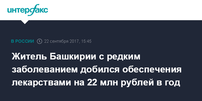 Москва. 22 сентября. INTERFAX.RU - Кировский районный суд Уфы обязал министерство здравоохранения Башкирии обеспечить мужчину, страдающего редким заболеванием, лекарствами стоимостью 22 млн рублей в год, сообщила пресс-служба прокуратуры республики в пятницу.
